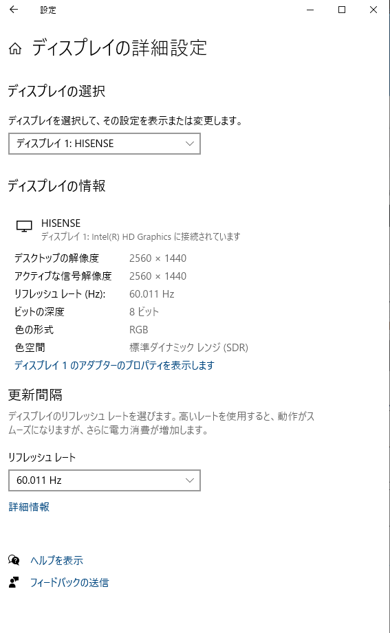 4Kの解像度は3,840×2,160ですが、Elite 8300のディスプレイ情報を見ると2,560×1,440となっています。これ以上は選択に出てきません。リフレッシュレートは60Hzとなっています。