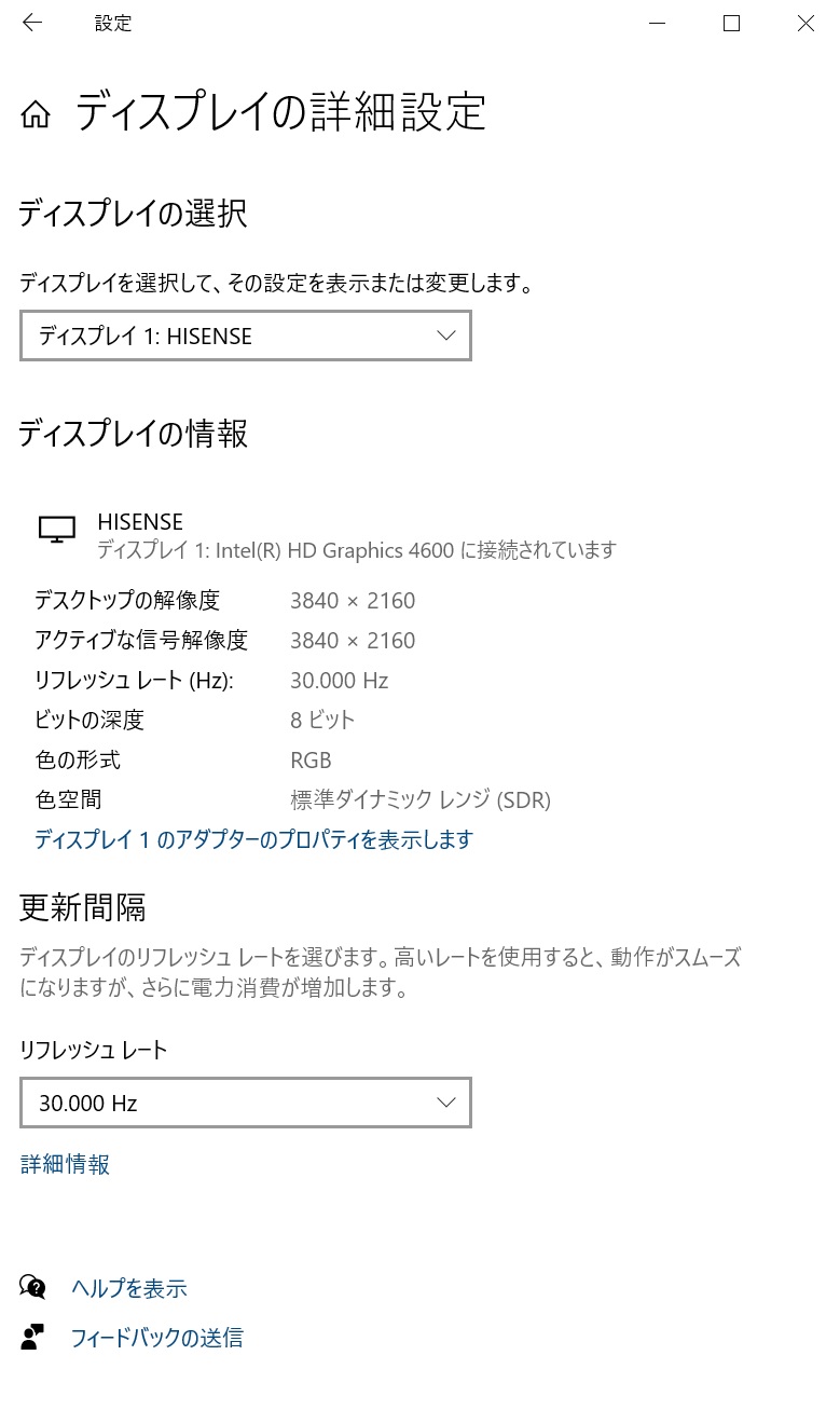 4K解像度は出ていますが、リフレッシュレートは30Hzとなっています。使用しているケーブルが30Hz対応です。もう1つのケーブルは4K@60Hz対応なので、60Hzに行けるかと思って繋いてみるとなぜか画面が真っ暗のままになってしまいます。内蔵のインテル® HD グラフィックス 4600は4K@60Hzが可能なようですが、Webで調べてみると、ドライバーを入れ直したり、いろいろする必要がありそうです。グラフィックボードを購入するのが手っ取り早いようですが、今のところゲームをやったり高画質で動画を見たりするわけではなく、30Hzでも困っていないので後々考えることにします。