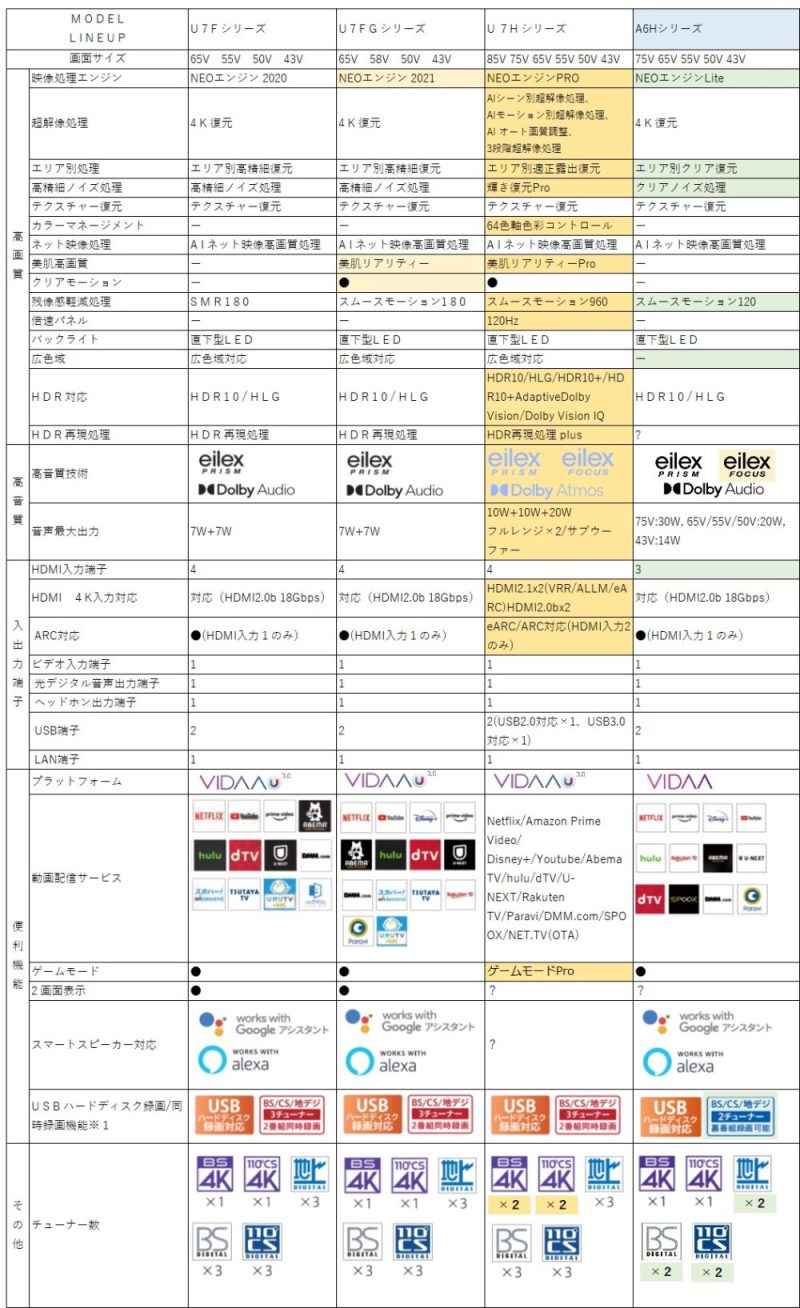U7Fは「NEOエンジン2020」、U7FGは「NEOエンジン2021」でしたが、A6Hでは「NEOエンジンLite」が搭載されています。NEOエンジンと言えば、東芝映像ソリューションとの共同開発による映像エンジンですよね。